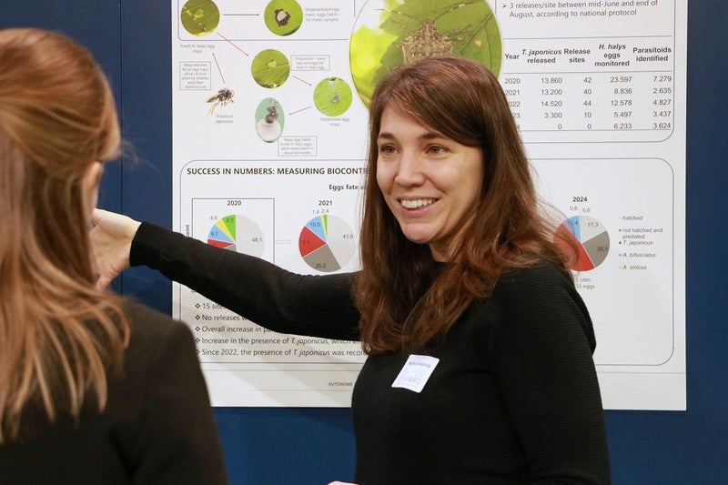 Auf der mittlerweile 13. Ausgabe der internationalen Apfelmesse Interpoma präsentierte das Versuchszentrum Laimburg vom 21. bis 23. November den Stand der Forschung zu verschiedenen Themen rund um den Apfel. Der Direktor des Versuchszentrums Laimburg, Michael Oberhuber, zeigte sich zufrieden: „Die Interpoma 2024 war ein voller Erfolg: Am Messestand gaben wir zahlreichen Besucherinnen und Besuchern Einblicke in unsere Forschungsprojekte und Tätigkeiten, wie beispielsweise die Regulierung der Marmorierten Baumwanze mithilfe der Samurai-Wespe, einem natürlichen Gegenspieler, eine Sortenausstellung mit Verkostung, die Präsentation des am Versuchszentrums entwickelten Blattsensors ‚FylloClip‘ zur Messung von Trockenstress sowie die Verarbeitung von Äpfeln zu Cider. Außerdem konnten Interessierte im Rahmen der ‚Interpoma Tours‘ unsere digitale Obstwiese ‚LIDO - Laimburg Integrated Digital Orchard‘ in Pfatten besuchen, Versuche zu neuen Anbausystemen beim Apfel besichtigen und sich über neue Trends in der Obstlagerung informieren“. Ein weiteres Highlight war die Gründung der länderübergreifenden „Allianz für Obst-, Wein- & Gemüsebau“ zur Stärkung der Forschung, Aus- und Weiterbildung in diesen Sektoren im Rahmen einer Pressekonferenz am 21. November. Zudem wurde am Messestand des Versuchszentrums das Buch „Von Bäumen & Früchten” vorgestellt, herausgegeben vom Bund Südtiroler Baumschulen und verfasst in Zusammenarbeit mit Forscherinnen und Forschern des Versuchszentrums Laimburg.