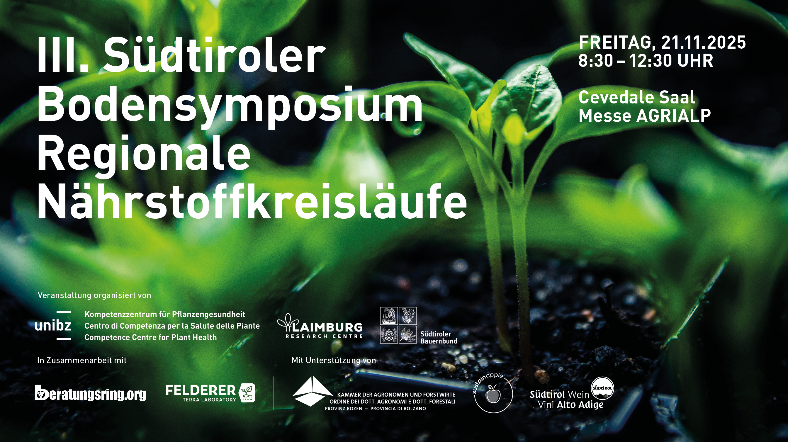 Iscrizione: La partecipazione richiede iscrizione, dal martedì 1 ottobre ore 12:00 al lunedì 17 novembre ore 12:00, tramite il modulo III Convegno sul suolo in Alto Adige.