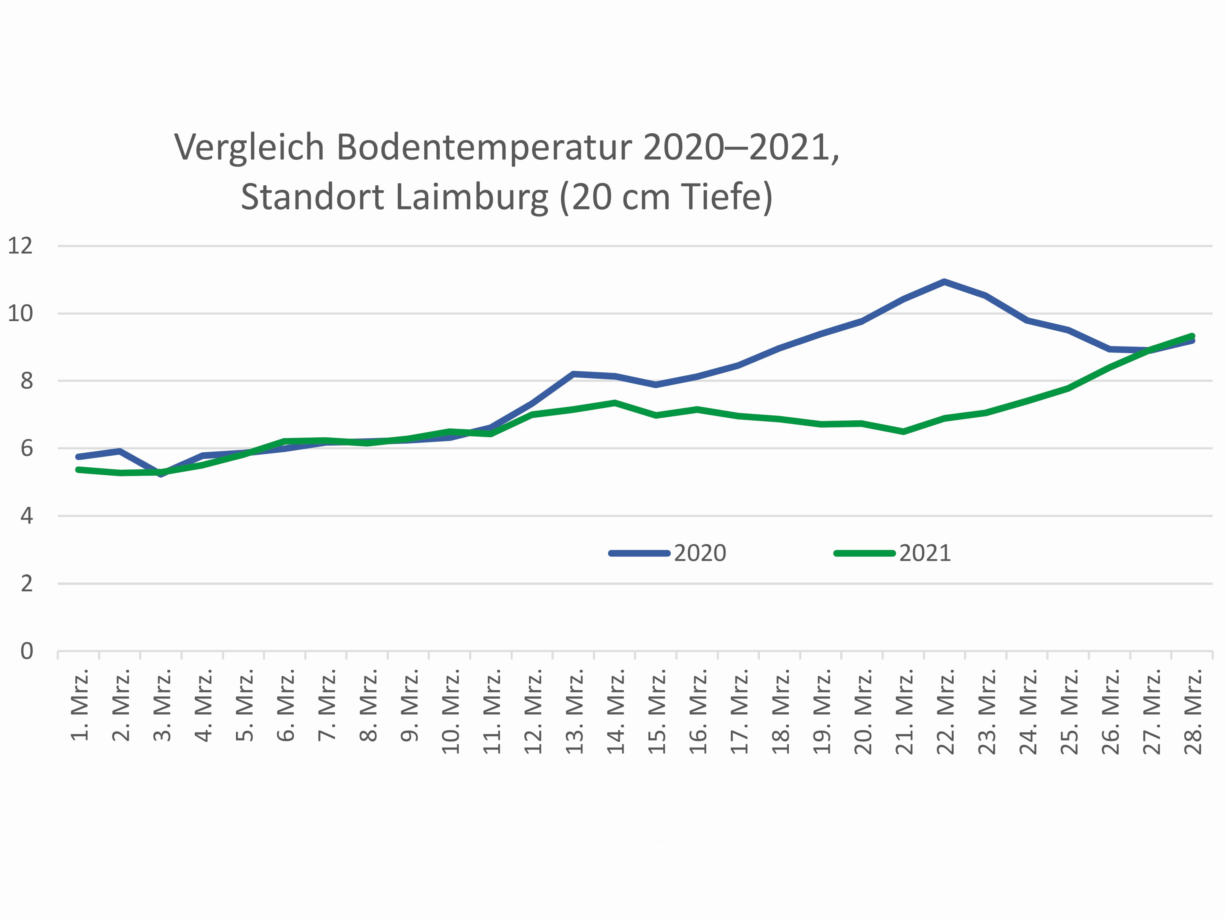 L'esattezza della previsione della data di piena fioritura dipende in larga misura dal tempo dei prossimi giorni. Quest'anno è stato più caldo della media fino a metà marzo, il che ha portato a un rapido progresso della vegetazione. Tuttavia, tra il 17 e il 24 marzo ci sono state sei notti di gelo e nel sito di Laimburg, come anche in altre zone, è stata attivata l'irrigazione antibrina. L'uso dell'irrigazione raffredda la temperatura del suolo e quindi rallenta gli stadi vegetativi. Nel 2017, una sola notte di gelo il 20 aprile era stata sufficiente a causare perdite di volume e di qualità del raccolto in grandi aree di coltivazione di mele in Europa e alle altitudini più elevate in Alto Adige.